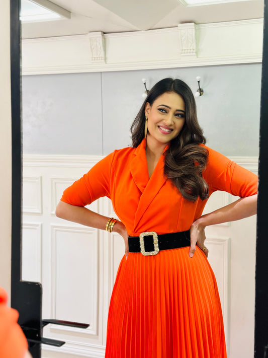 Elegant Solid Pleated Long Sleeve Orange Dress