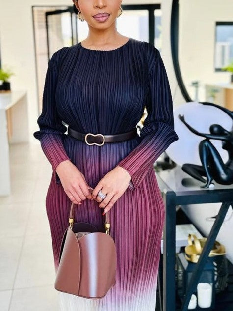 Fashionable Gradient Long Sleeve Pleated Wine Red Dress - Ships in 24 Hrs