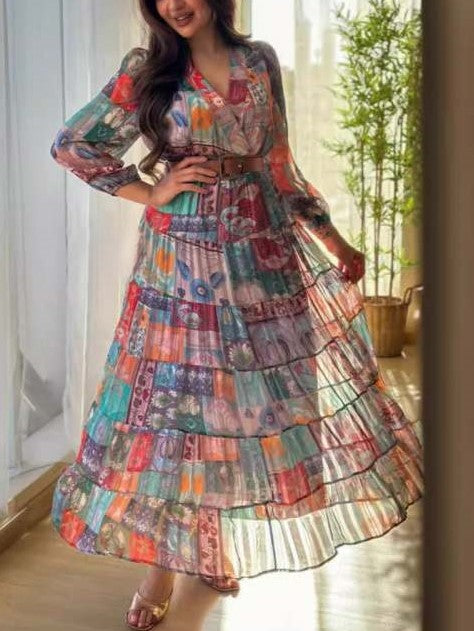 Fashionable Pleated Printed Long Sleeve Swing Dress
