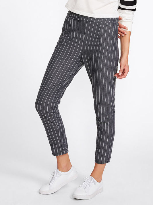 Formal Grey Pinstriped Capri Elastic Waist Pants - Ships in 24 hrs