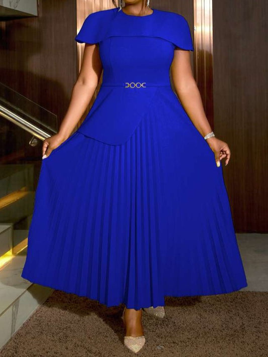 Modern Pleated Crewneck Cape Sleeve Maxi Dress