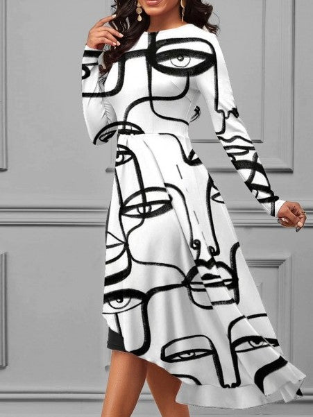 New Style Printed Irregular Crew Neck White Dress - Ships in 24 Hrs