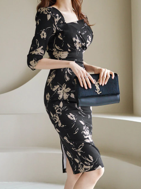 New Arrival Knee Length Printed Black Pencil Dress