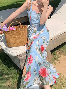 Bohemian French Style Floral Print Strap Holiday Dress