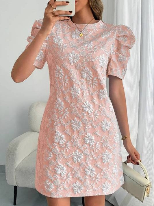 Sweet Floral Texture Puff Sleeve A Line Pink Mini Dress