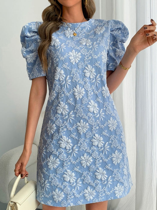 Sweet Floral Texture Puff Sleeve A Line Blue Mini Dress
