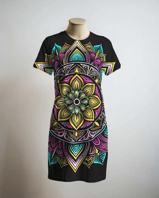 Unique Mandala Print Black T Shirt Dress