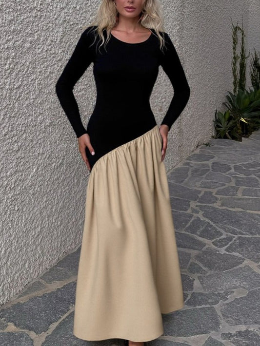 Modern Ruched Long Sleeve Contrast Color Maxi Dress