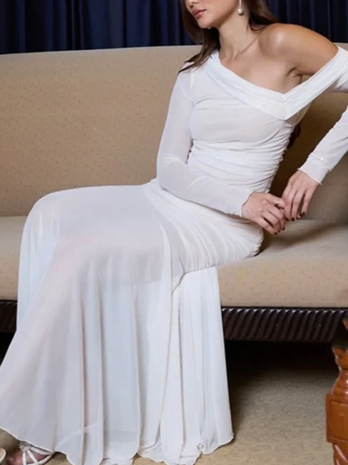 Party Fashion Metallic One Shoulder Pleated Silver Maxi Dress