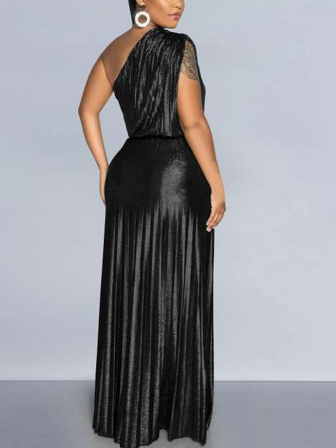 Party Fashion Metallic One Shoulder Pleated Maxi Dress