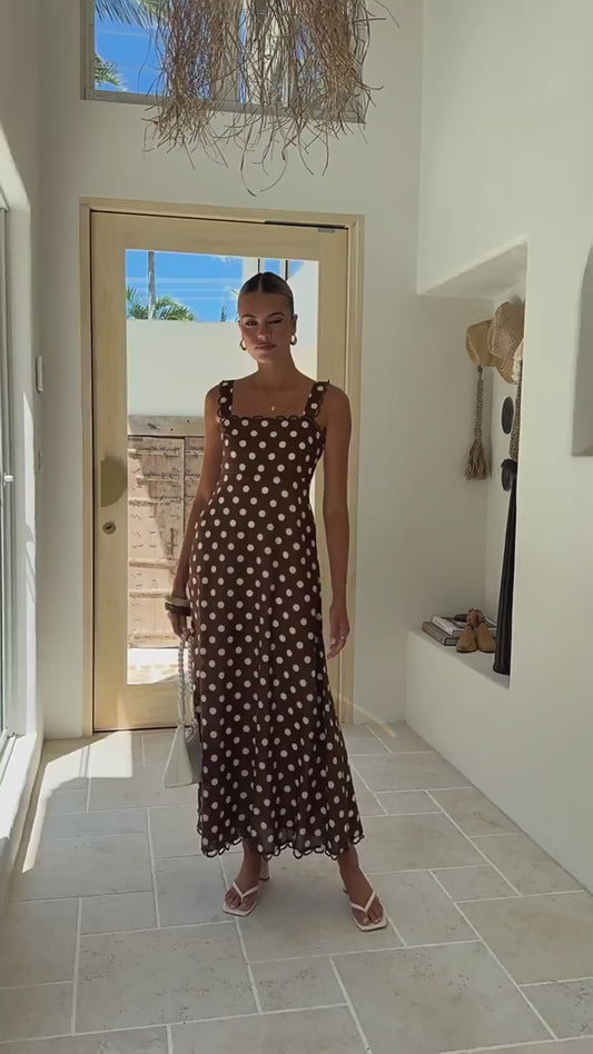 Summer Exclusive Smocked Polka Dots Sleeveless Coffee Maxi Dress