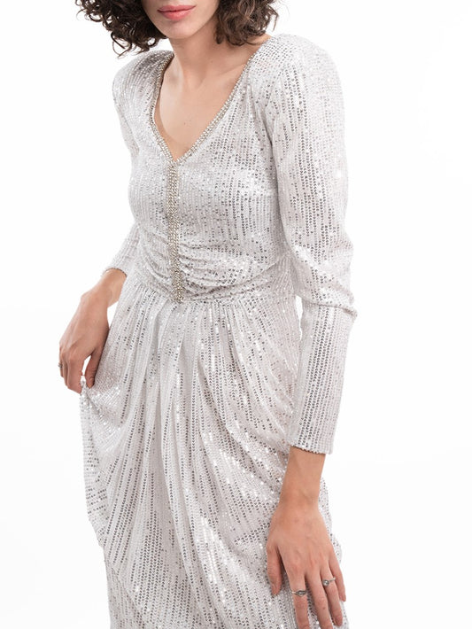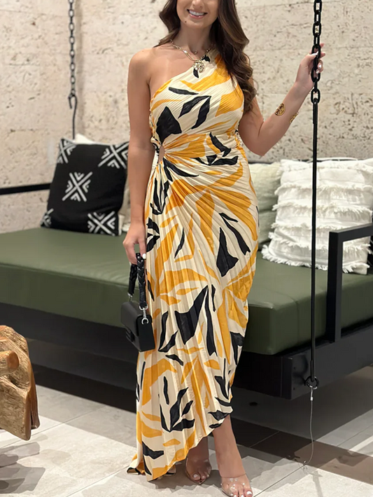 Party Fashion Metallic One Shoulder Pleated Maxi Dress