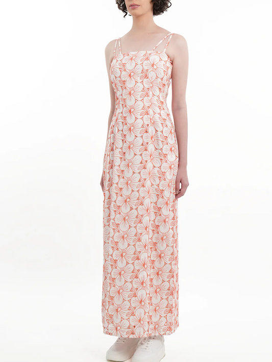 Summer Wear Peach Floral Eyelet Maxi Dress