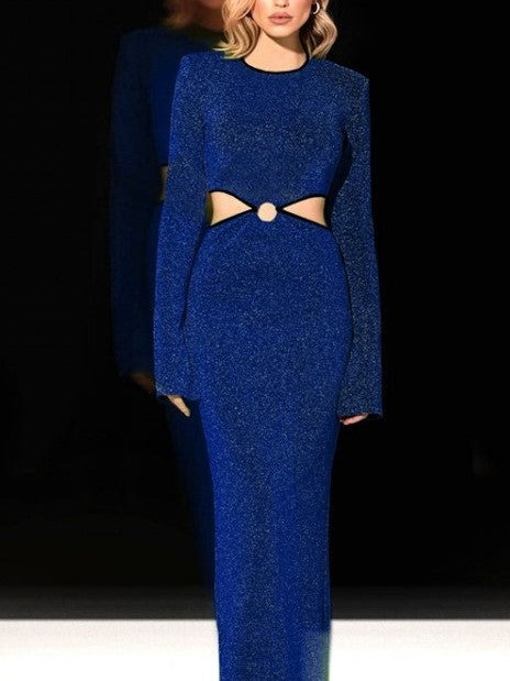 Party Wear Shiny Blue Hollow Out Long Sleeve Maxi Dress
