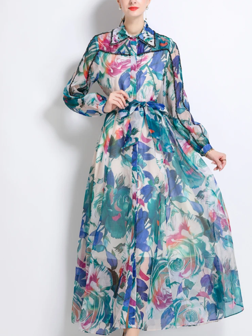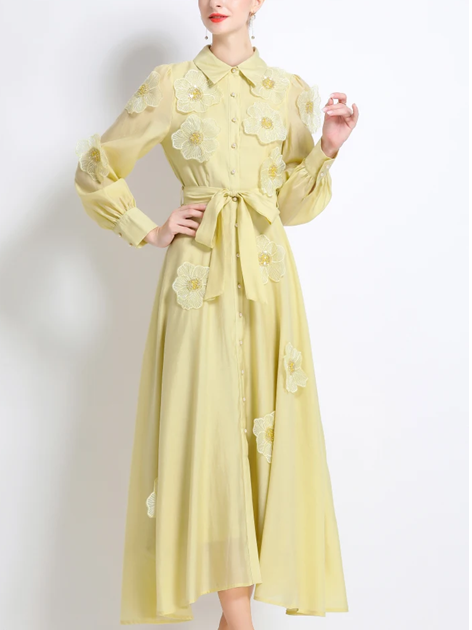 Vintage Flower Embroidery Long Sleeve Yellow Party Dress