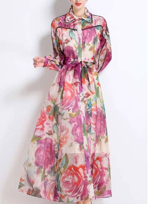 Vintage Flower Embroidery Long Sleeve Pink Party Dress