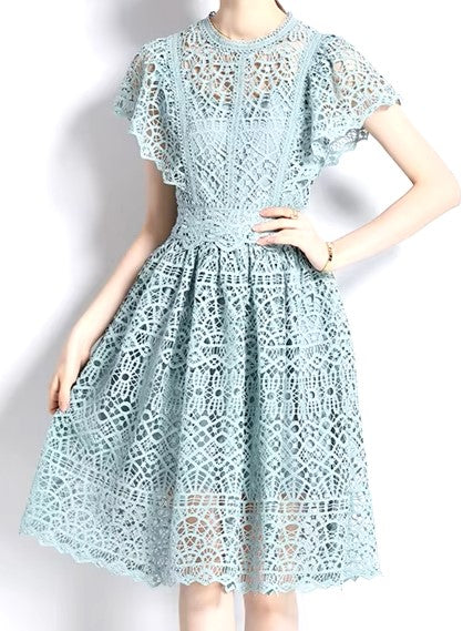 Beautiful Lace Mesh Short Sleeve High Waist Blue Dress
