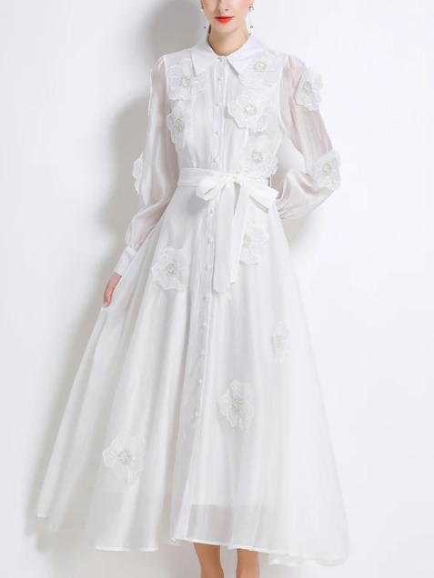 Vintage Flower Embroidery Long Sleeve White Party Dress
