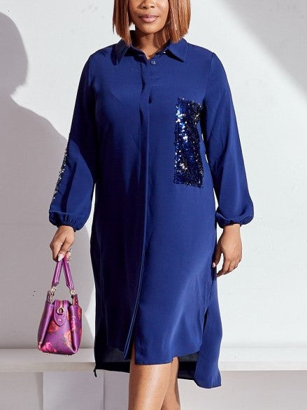 Smart Sequin Patchwork Mid Length Blue Shirt Dress -Ships in 24 Hrs