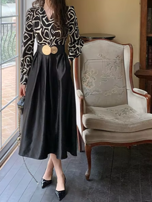 Gorgeous Satin Splicing Long Sleeve Black Printed Dress - Ships in 24 Hrs