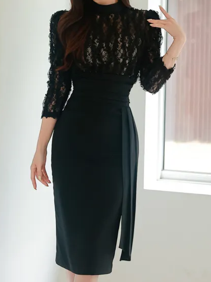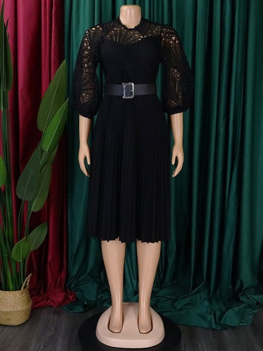Elegant Geometric Pattern Lace High Rise Long Sleeve Black Dress