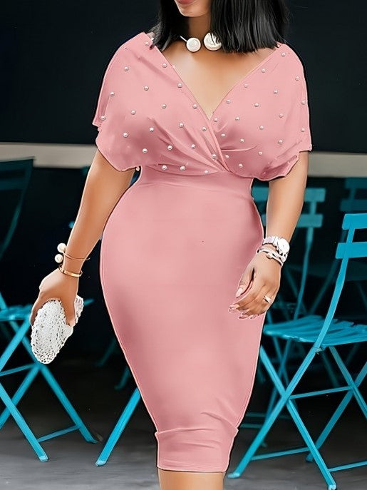 Classy Pearl Decor V Neck Pink Dress