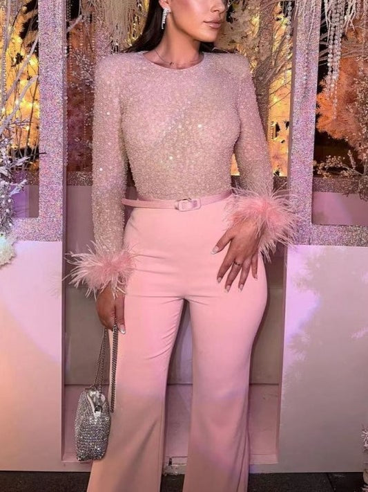 Gorgeous Pink Feather Decor Long Sleeve Jumpsuit