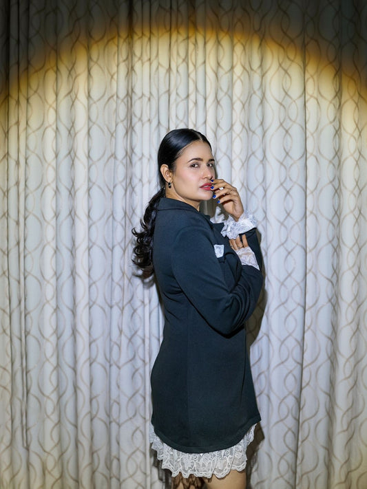 Fabulous Lace Panel Black Lapel Blazer Mini Dress - Ships in 24 Hrs