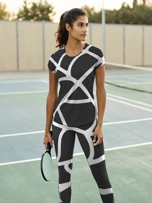 Pickleball | Paddleball | Activewear Coord Set Tshirt With Tummy Tuck Leggings | Black Web Print