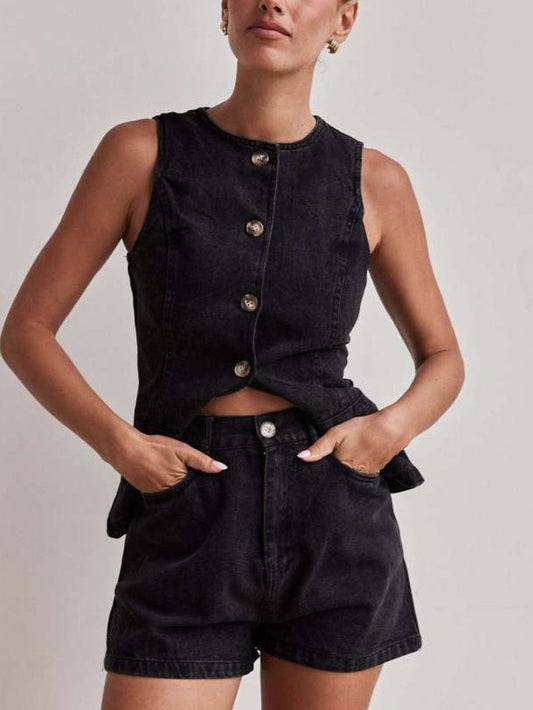 Classic Look Denim Crew Neck Sleeveless Top With Wide Leg Pants Black Co Ord Set
