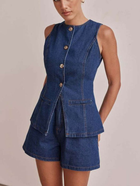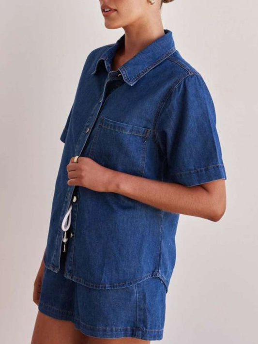 Chic Denim Button Up Shorts Light Blue Co ord Set