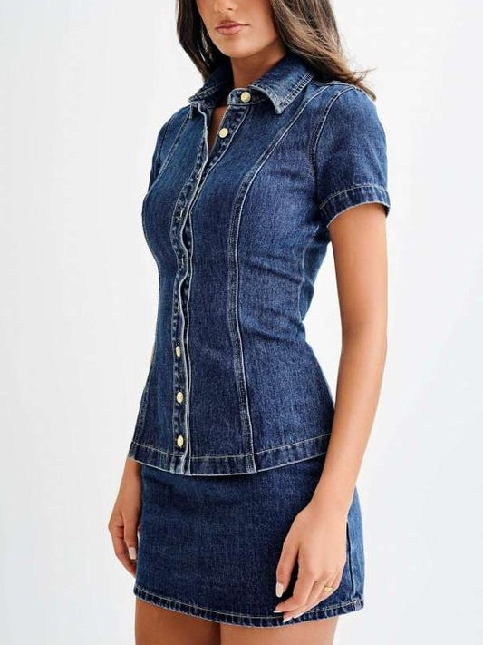 Stylish Denim Short Sleeve Fitted Skirt Set