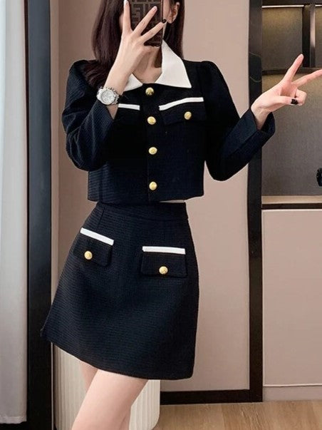 New Arrival Colorblock Short Coat Top With Bodycon Pencil Skirt Black Set - Ships in 24 Hrs