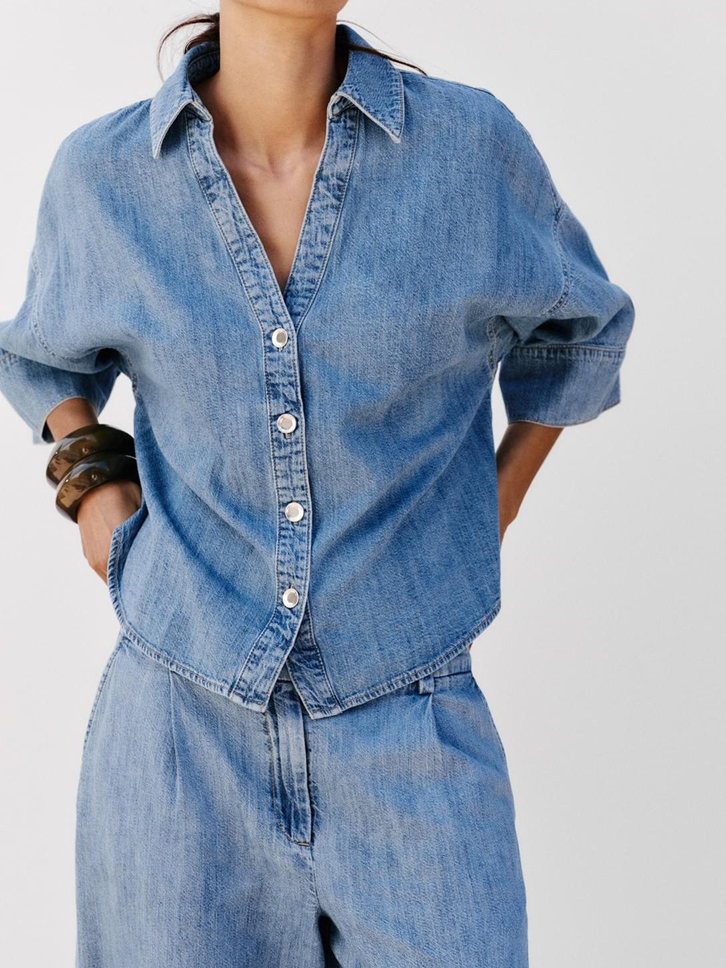 Lapel collar shirt with a V-neck and wide sleeves that fall below the elbow. Asymmetric hem and a metal button-up front.