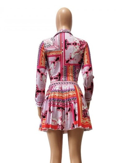 This chic shirt and mini pleated skirt set is perfect for any vacation. The bright colors bring a fun, tropical feel, while the long sleeve shirt ensures you stay comfortable on your trip.