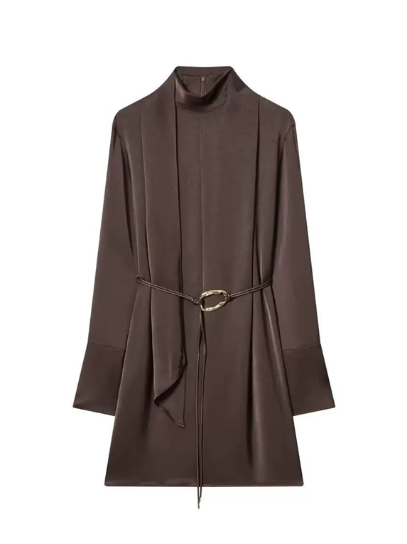 Elevate your everyday elegance with this sophisticated mini dress featuring a refined high neckline and long sleeves. Crafted from satin-finish woven polyester, the fabric offers a luxurious soft sheen with a silky, lightweight drape that moves gracefully with you. The relaxed fit ensures comfortable all-day wear, while the slim rope belt with gold hardware cinches the waist for a polished, defined silhouette. Perfect for transitioning from casual to semi-formal occasions. Hand wash cold or gentle machine wash; hang to dry and cool iron on reverse for best results.