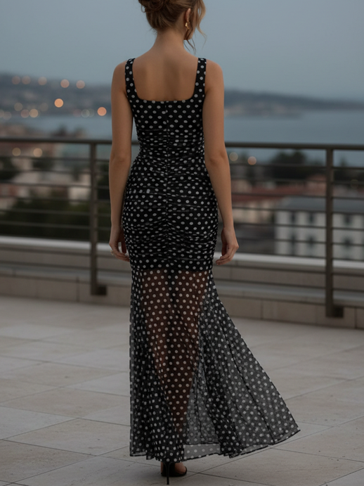 Stylish Sheer Ruched Polka Dot Black Maxi Dress