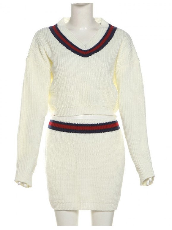 Classy Winter Style Knit Stripped Trim V Neck Cropped Skirt Set