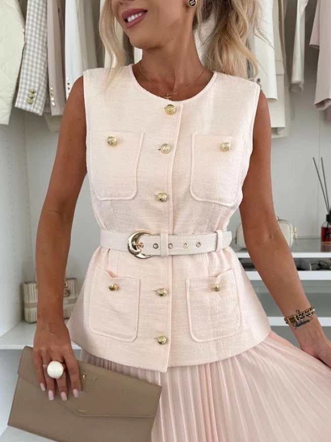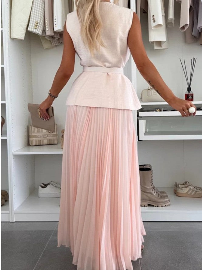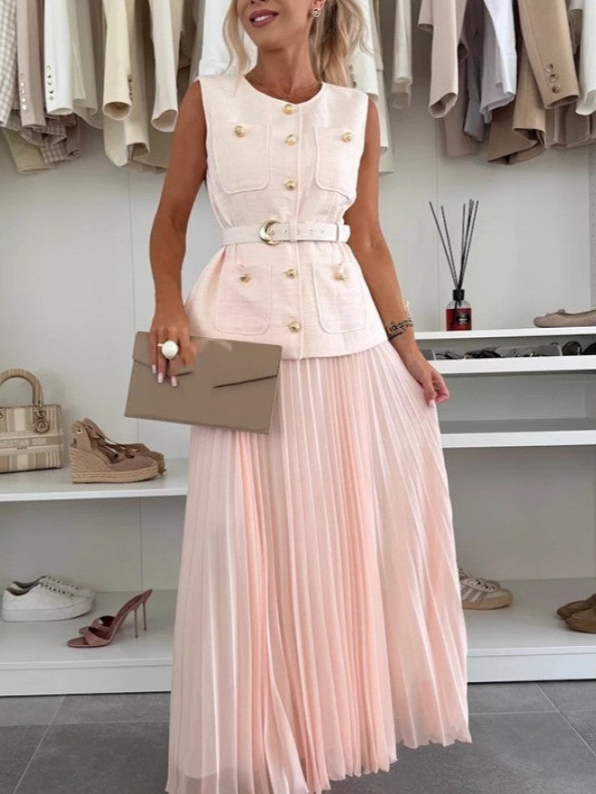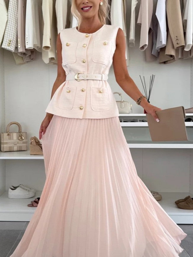 Elite Button Up Vest With Gauze Pleated Pink Skirt Set
