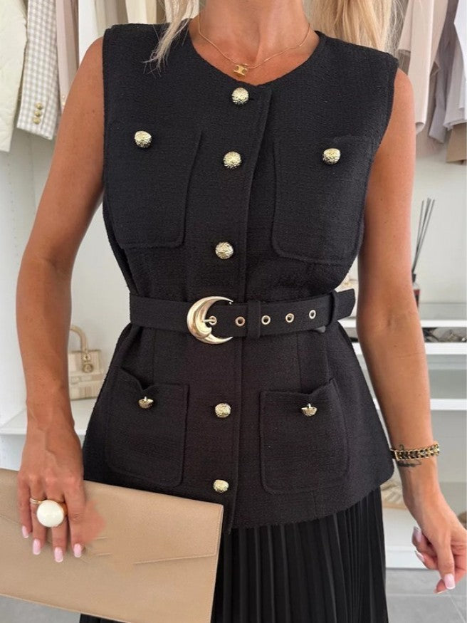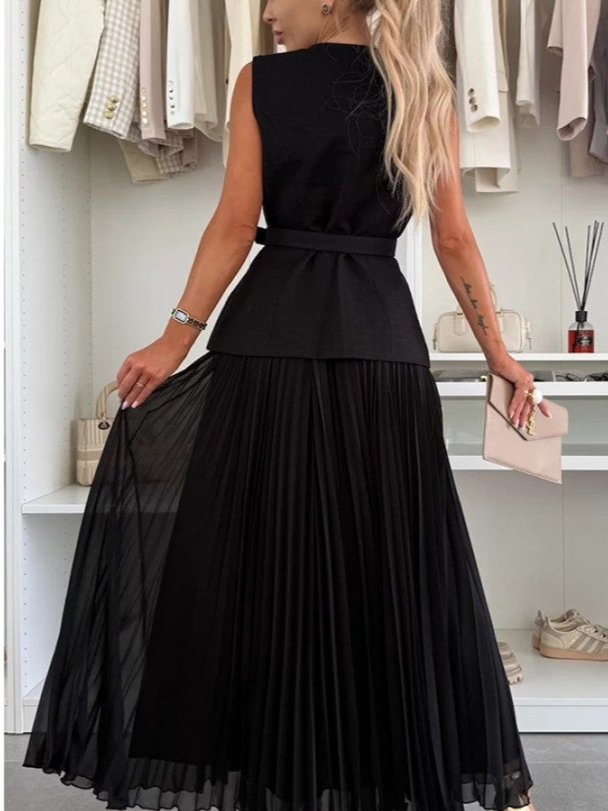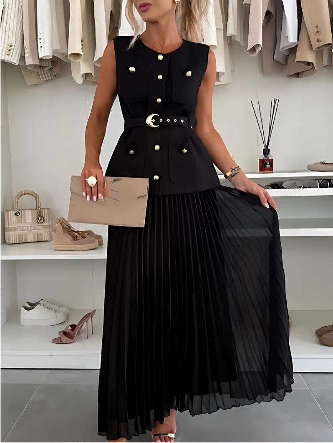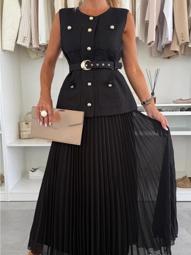 Elite Button Up Vest With Gauze Pleated Skirt Set