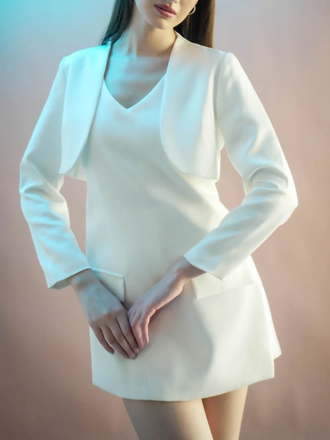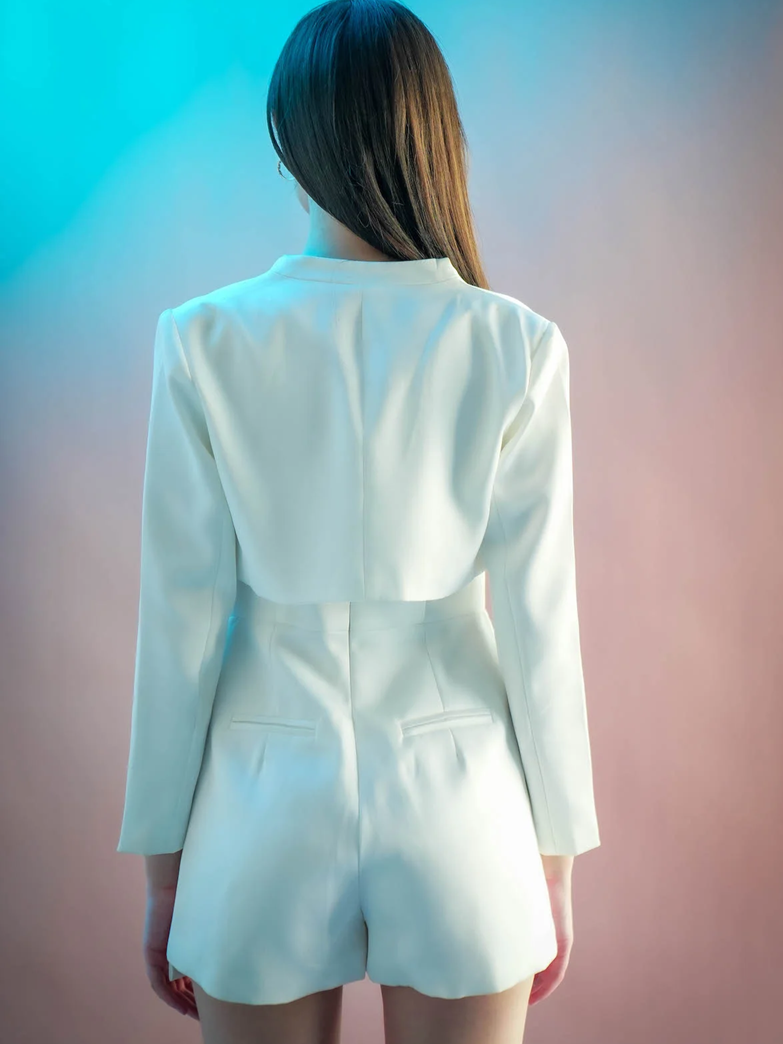 Chic meets modern sophistication in a sleek satin playsuit appearing like a dress paired with a tailored cropped jacket. This sleeveless, short jumpsuit stuns in luminous white, featuring a clean silhouette with a smart centre-back zip and discreet front pockets for effortless ease. The coordinating jacket adds a sharp, structured touch, balancing soft satin with contemporary edge. Perfect for upscale brunches, rooftop cocktails, or any occasion where polished meets playful, this set is your go-to for standout style with minimal effort.