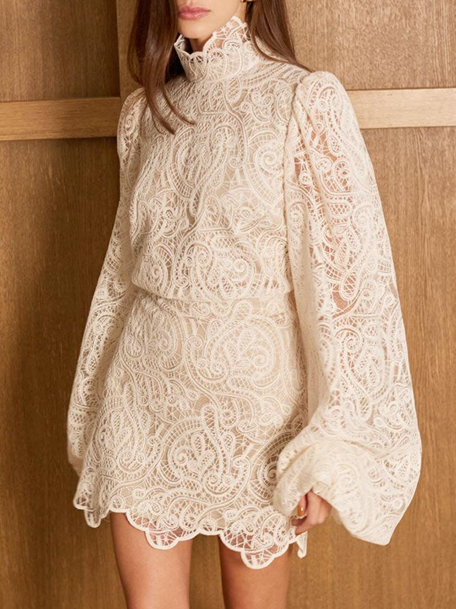 This elegant white lace set features a delicate lace fabric that adds a touch of sophistication. The exquisite lantern sleeve turtle neck top offers a refined silhouette, perfectly complemented by an above-knee skirt that balances style and comfort. Ideal for formal occasions or stylish daywear, this ensemble combines classic design with modern detailing for a polished, expert look.