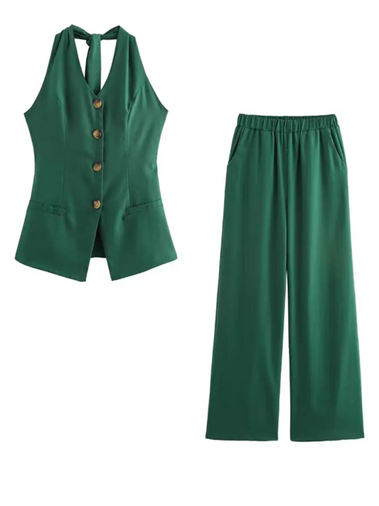Smart Tied Halter Neck Waist Coat With Wide Leg Pants Green Set