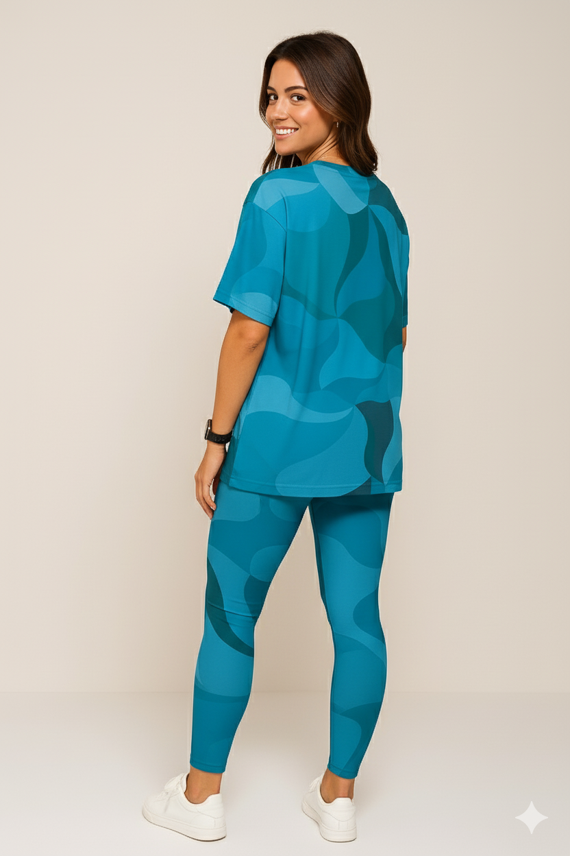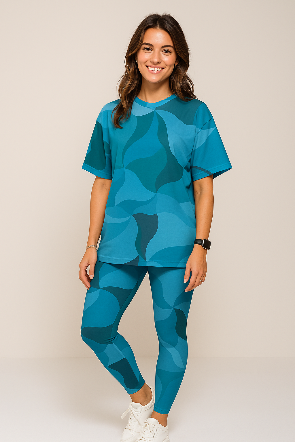 Fashionable Blue Camouflague Print Premium Oversized Tee With Tummy Tuck Body Shaping Leggings Co-ord Set