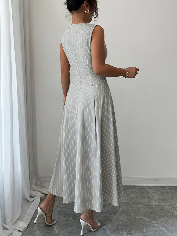 Formal Wear Striped V Neck Vest With Skirt Grey Set