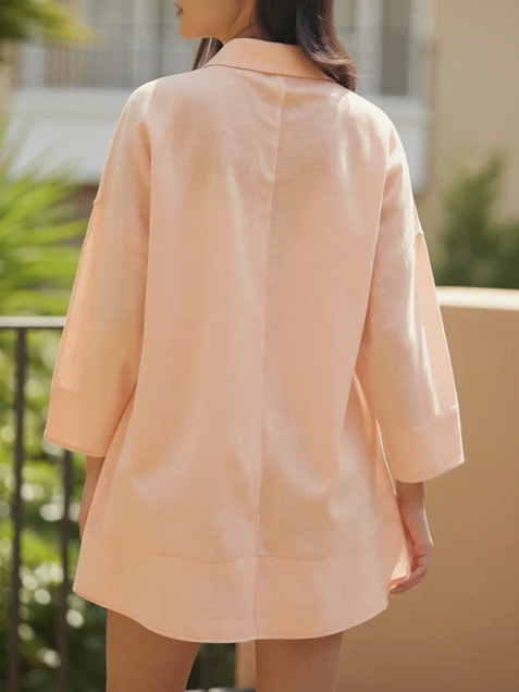 Embrace effortless elegance with this peach linen co-ord set, where timeless design meets everyday comfort. The oversized button-up shirt features delicate floral detailing and relaxed drop shoulders for a contemporary silhouette, while the high-waisted shorts offer a flattering fit with a gentle elastic waistband. Crafted from breathable linen, the set maintains opacity without sacrificing airflow—ideal for warm weather styling. Functional front pockets on the shorts add practical appeal. Perfect for casual outings, weekend retreats, or layered styling throughout the seasons.