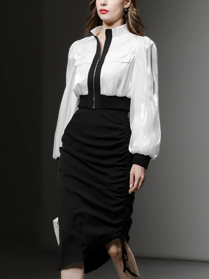 This Sharp Look Contrast Zipper Top With High Waist Pencil Skirt Set is a stylish and comfortable choice for any wardrobe. Featuring a white zipper top with contrast details, puff sleeves, and a stand collar, this set is complete with a black skirt that has a high waist and mid calf length. Wear this set and look sharp in any occasion