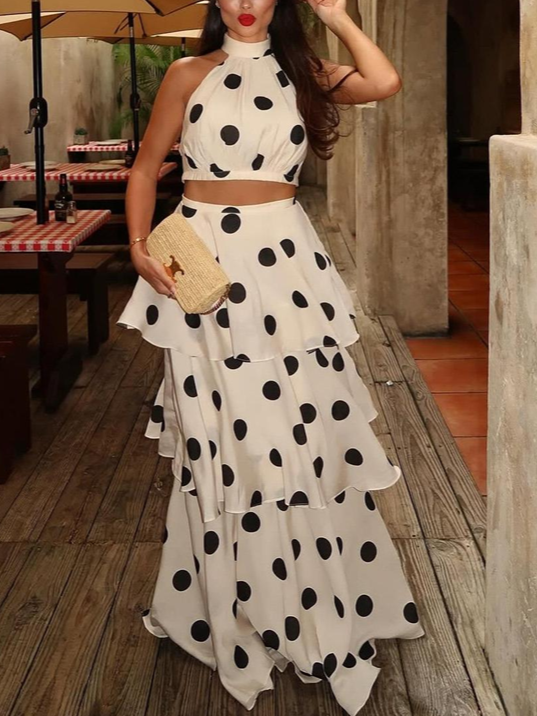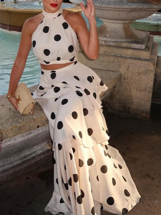Suave Dot Halterneck Crop Top With Long Skirt Set
