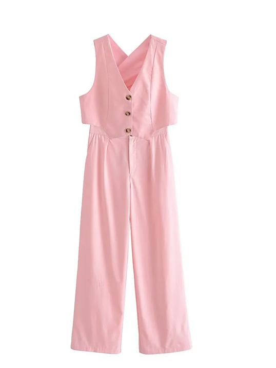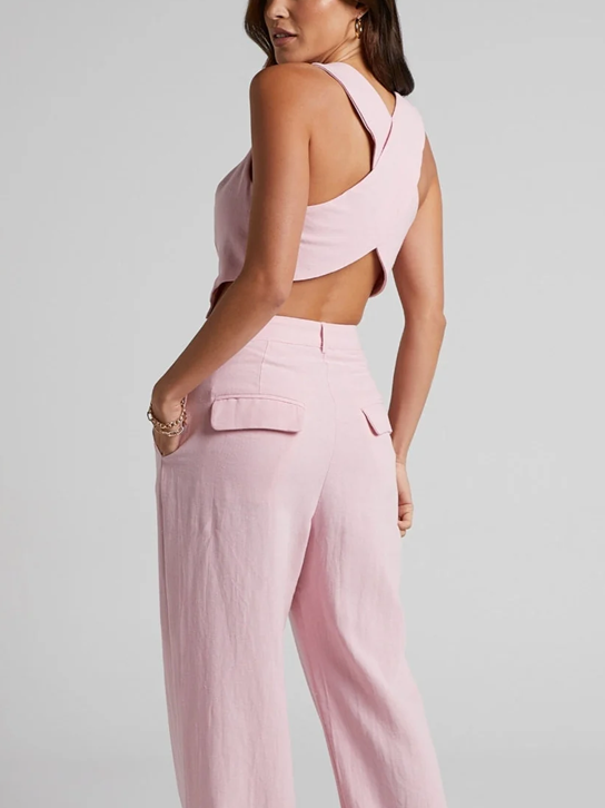 Summer Fashion Crop Waist Coat And Wide Leg Pink Pants Set