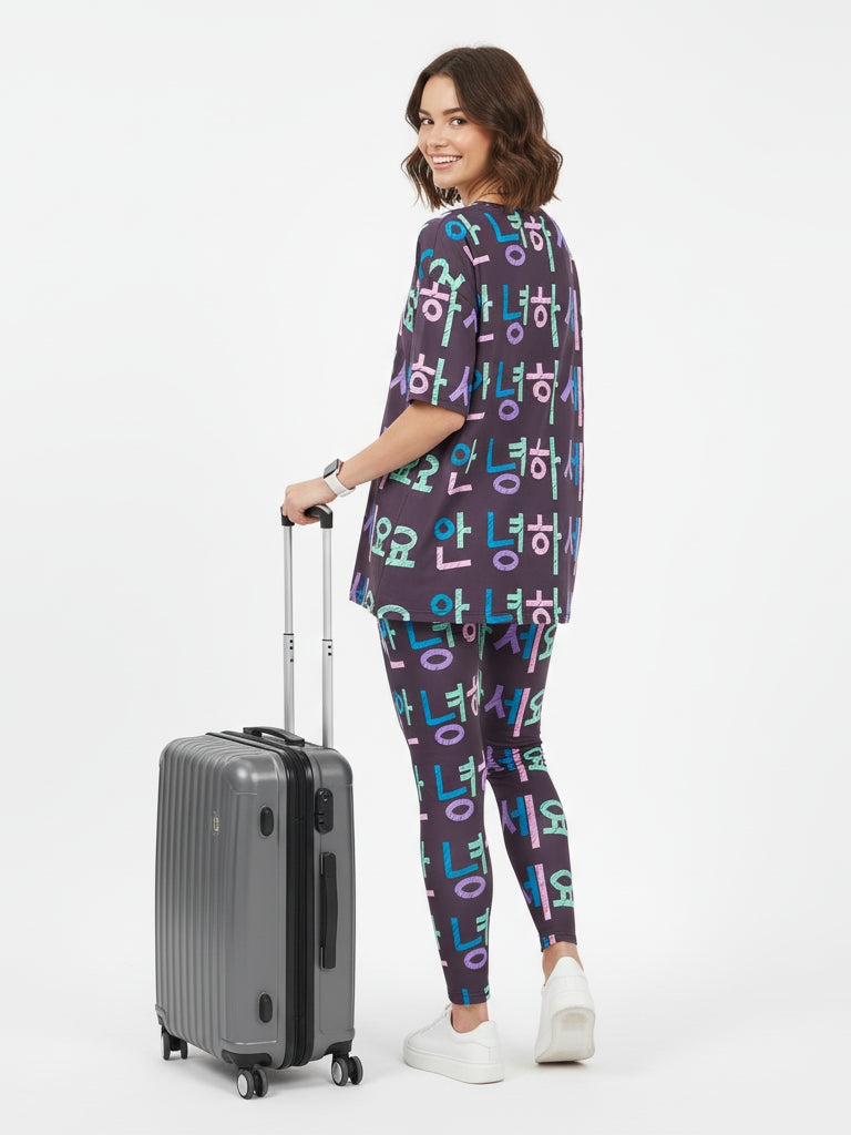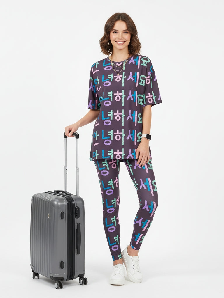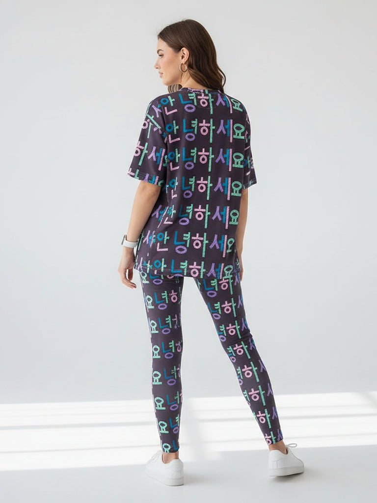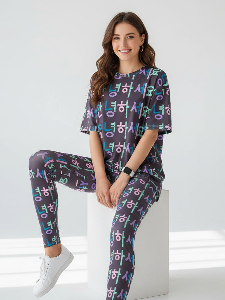 Trending Korean Hello Print Premium Oversized Tee With Tummy Tuck Body Shaping Leggings Co-ord Set